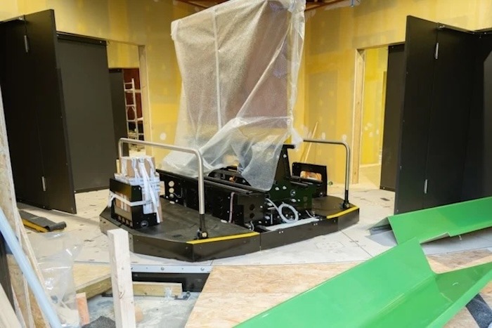 The main platform for the ride has been installed, the ride vehicles will sit atop this platform as the entire ride rotates as part of the experience. The divide between internal scene (themed) and the external scene (screens) are now outlined. In some cases, this role is reversed whereas some internal scenes could also have screens.